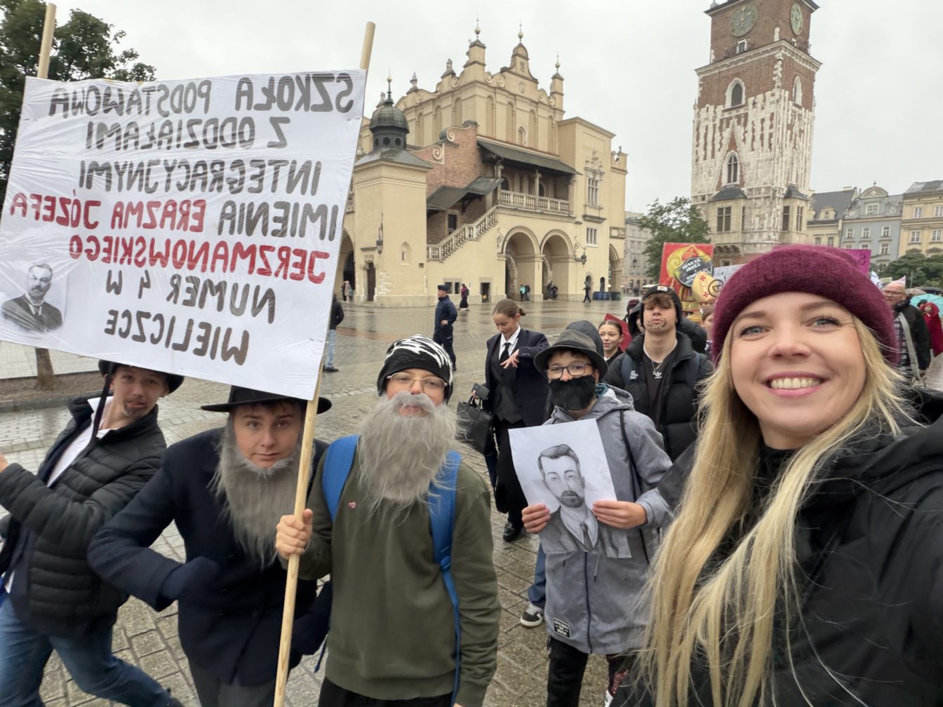3. Zdjęcie grupowe uczniów na tle Wawelu z banerem szkoły i portretem E.J. Jerzmanowskiego..