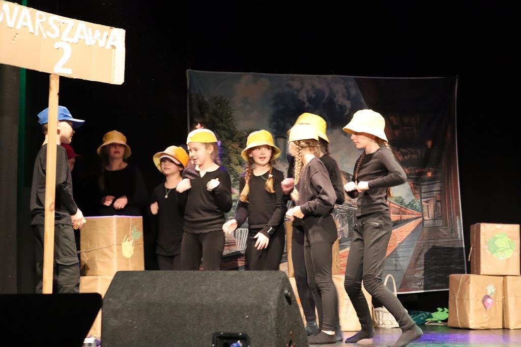 Dzieci występujące podczas XII gminnego przeglądu teatrzyków w Wieliczce. Inscenizacja przygotowana przez występujących