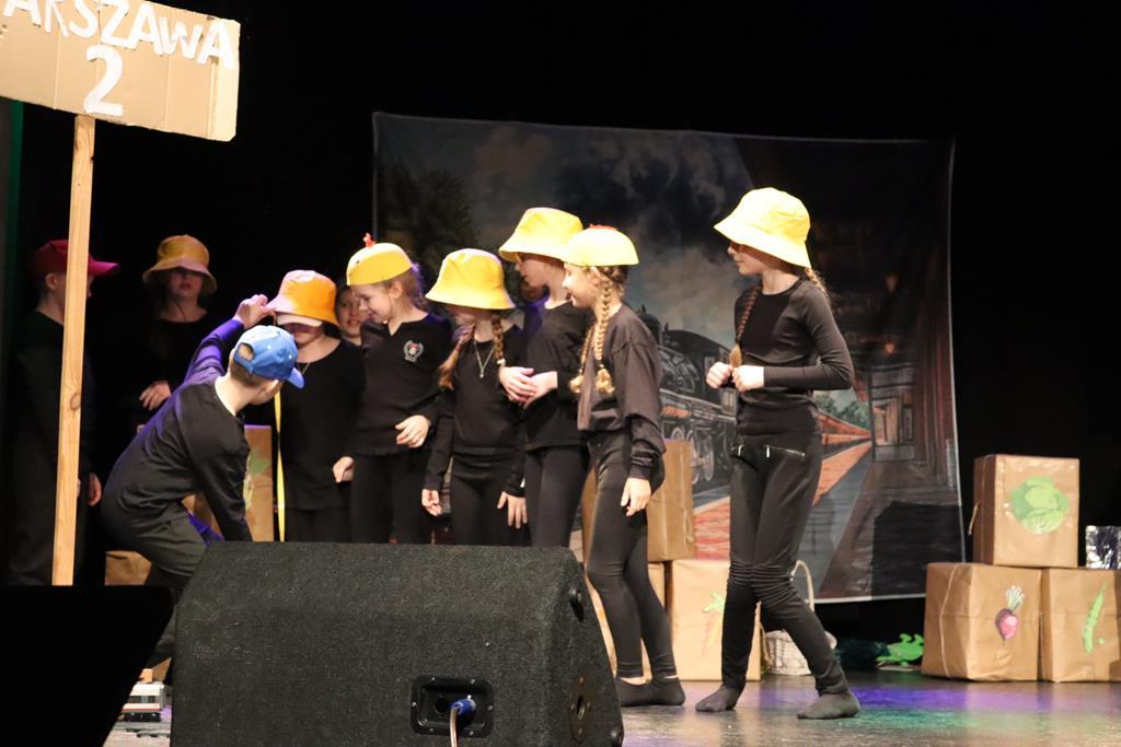 Dzieci występujące podczas XII gminnego przeglądu teatrzyków w Wieliczce. Inscenizacja przygotowana przez występujących