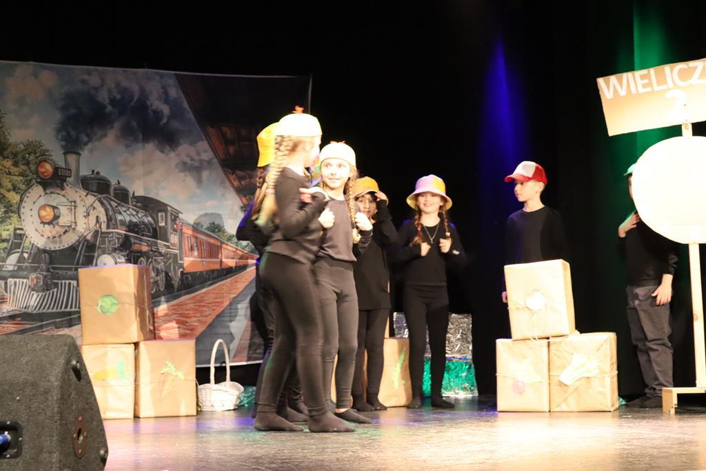 Dzieci występujące podczas XII gminnego przeglądu teatrzyków w Wieliczce. Inscenizacja przygotowana przez występujących