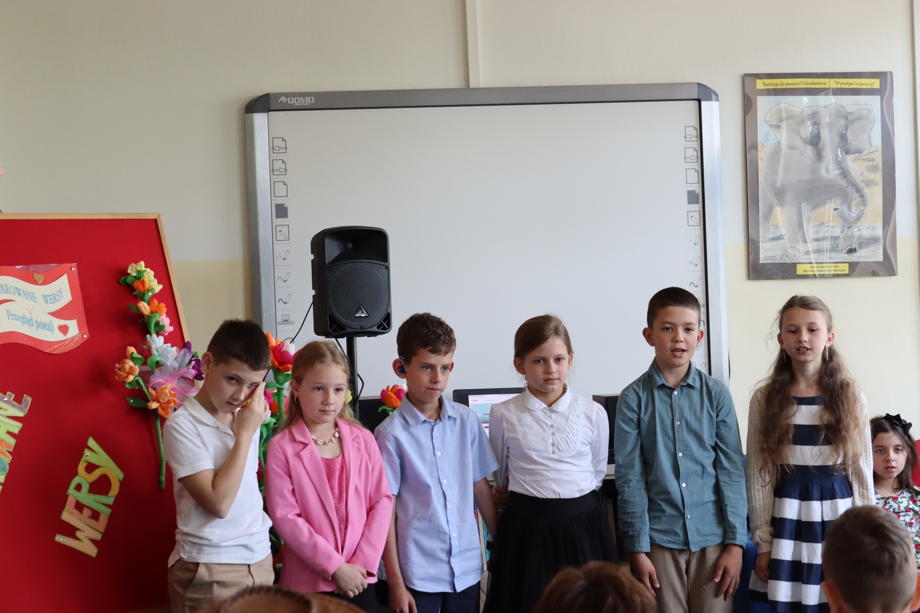 W jubileuszowej edycji wzięło udział ponad 60 uczniów z klas 1-8, którzy z ogromnym zaangażowaniem i sercem zaprezentowali wybrane utwory poetyckie. Recytacje były pełne emocji, wyobraźni i indywidualnej interpretacji – nie zabrakło ani klasyki poezji dziecięcej, własnych utworów, ani nowoczesnych, zaskakujących tekstów.