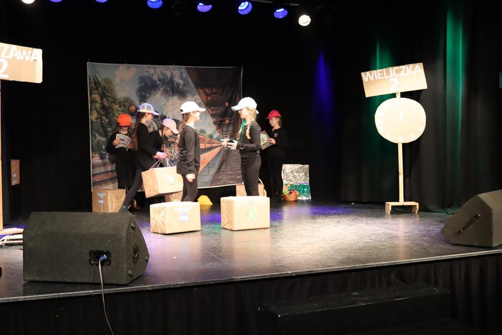 Dzieci występujące podczas XII gminnego przeglądu teatrzyków w Wieliczce. Inscenizacja przygotowana przez występujących