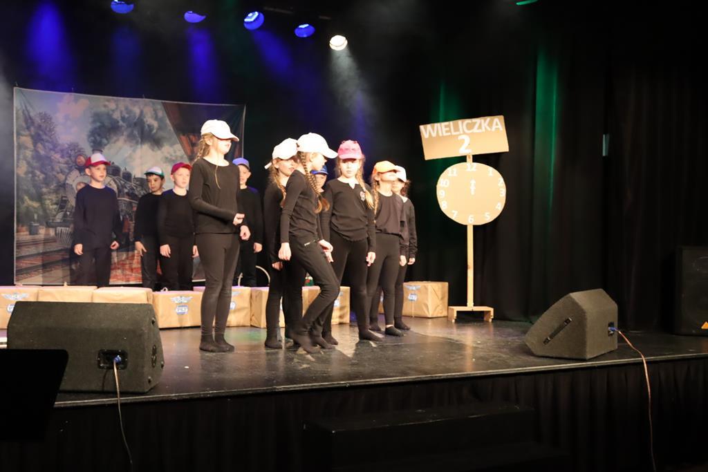 Dzieci występujące podczas XII gminnego przeglądu teatrzyków w Wieliczce. Inscenizacja przygotowana przez występujących