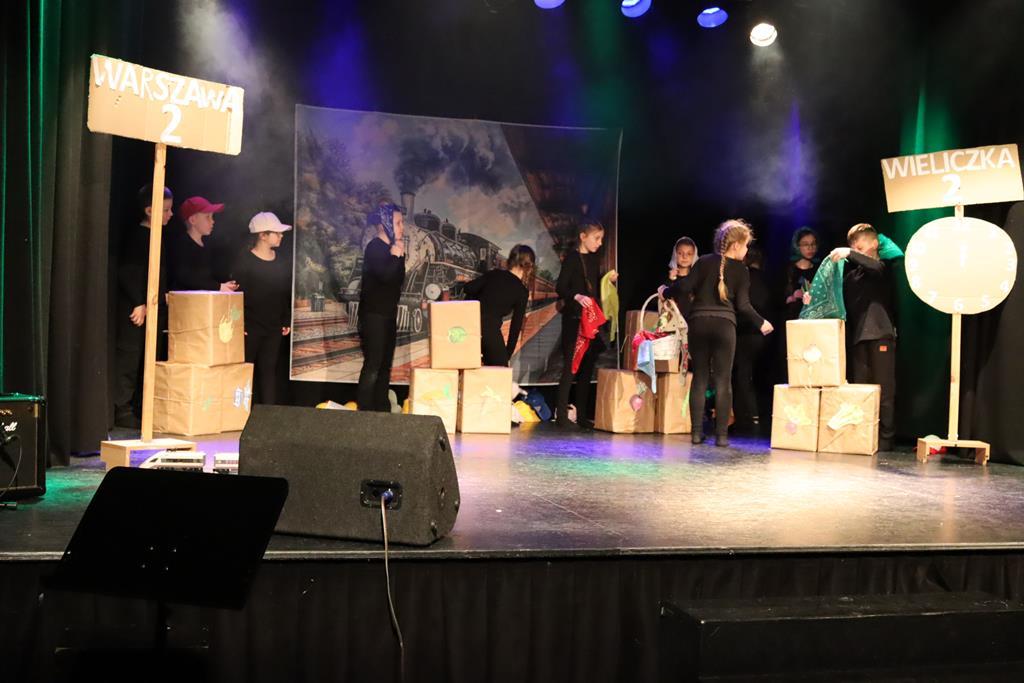 Dzieci występujące podczas XII gminnego przeglądu teatrzyków w Wieliczce. Inscenizacja przygotowana przez występujących