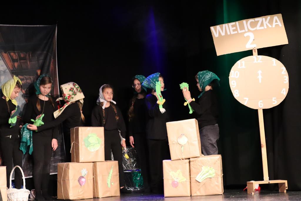 Dzieci występujące podczas XII gminnego przeglądu teatrzyków w Wieliczce. Inscenizacja przygotowana przez występujących