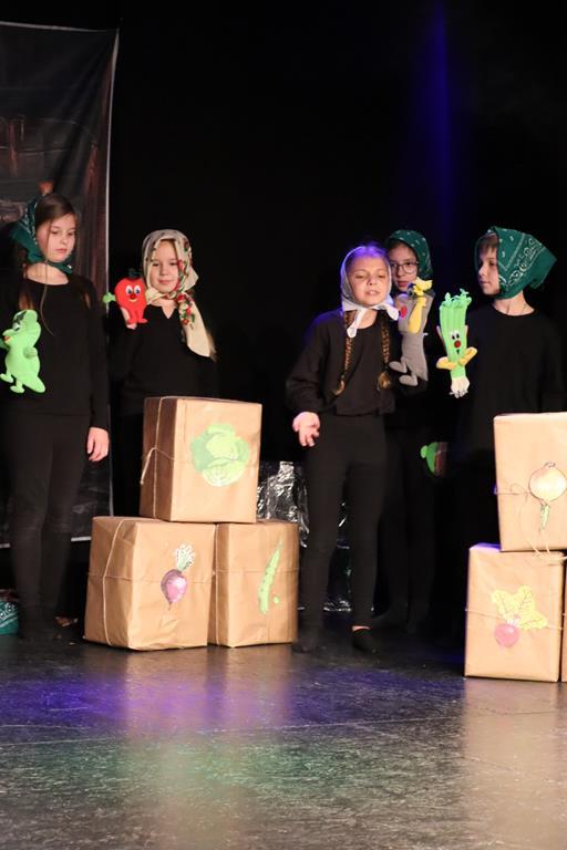 Dzieci występujące podczas XII gminnego przeglądu teatrzyków w Wieliczce. Inscenizacja przygotowana przez występujących