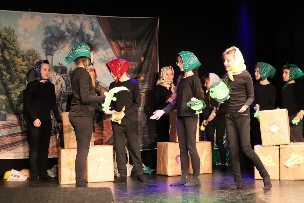 Dzieci występujące podczas XII gminnego przeglądu teatrzyków w Wieliczce. Inscenizacja przygotowana przez występujących