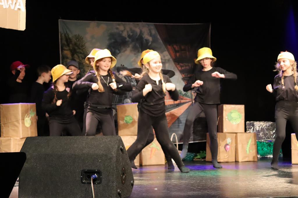 Dzieci występujące podczas XII gminnego przeglądu teatrzyków w Wieliczce. Inscenizacja przygotowana przez występujących